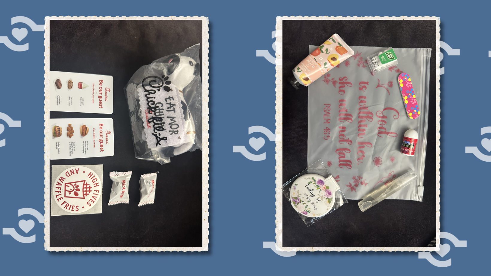 Gift distributions, including Chick-fil-A gift cards and curated gift bags